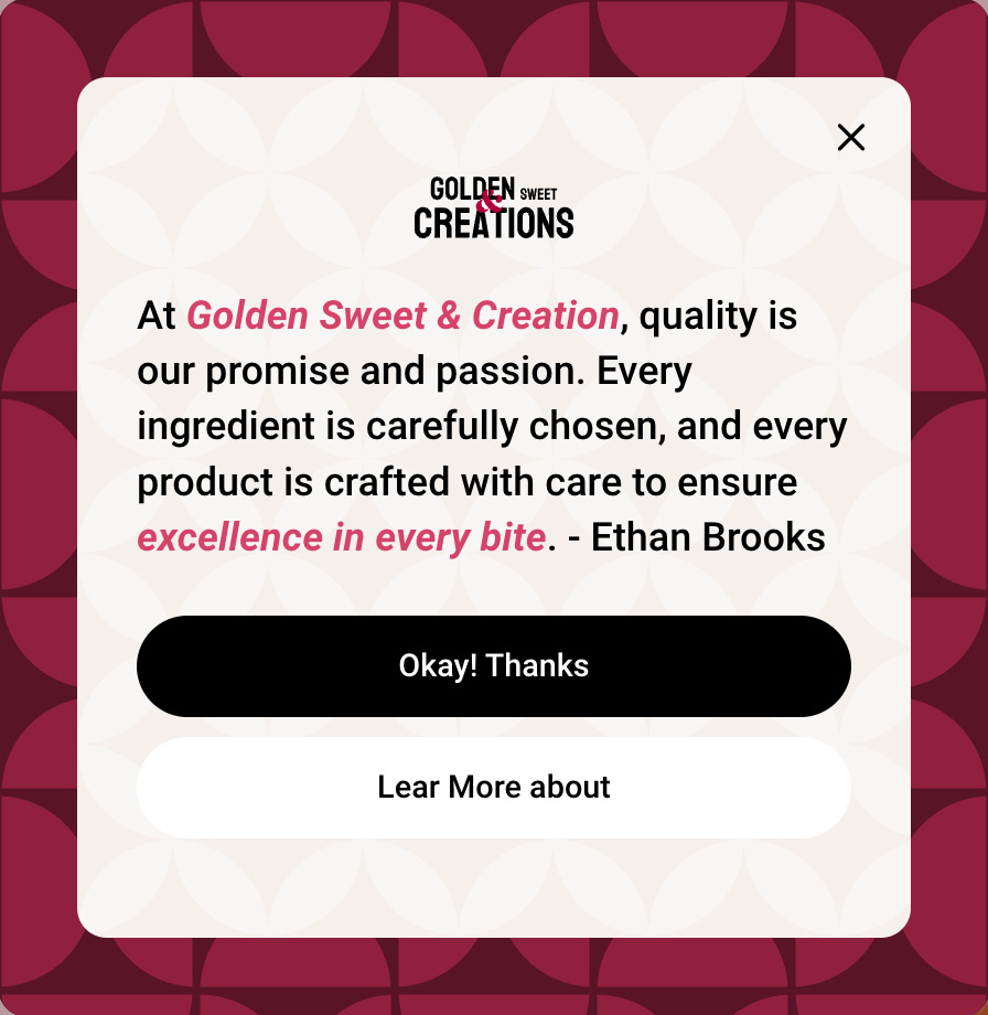 At Golden Sweet & Creation, quality is our promise and passion. Every ingredient is carefully chosen, and every product is crafted with care to ensure excellence in every bite. - Ethan Brooks